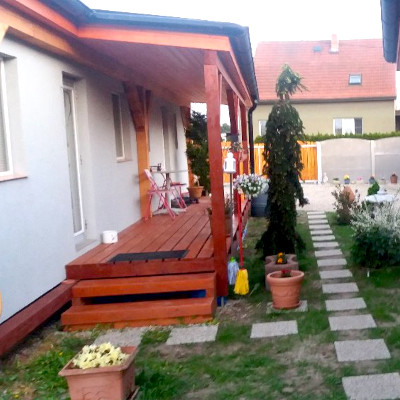 Ke každému zakoupenému mobilnímu domu dostanete jedny dřevěné schůdky jako dárek.